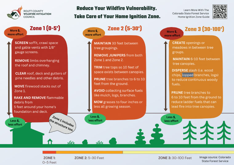 It’s a good idea to familiarize yourself with the Colorado State Forest Service’s Home Ignition Zone Guide before your evaluation. Having an understanding of the concepts, vulnerabilities and terminology will ensure that your evaluation is done as quickly and efficiently as possible.